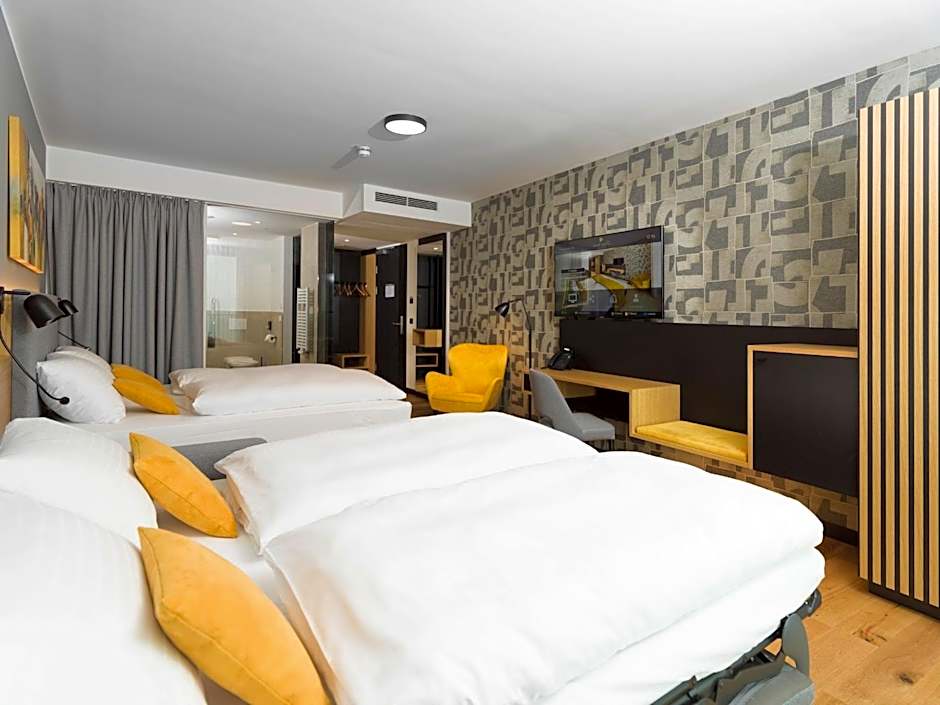 The spacious quadruple room offers air conditioning, a mini-bar, a tea and coffee maker, as well as a balcony. The unit has 3 beds.